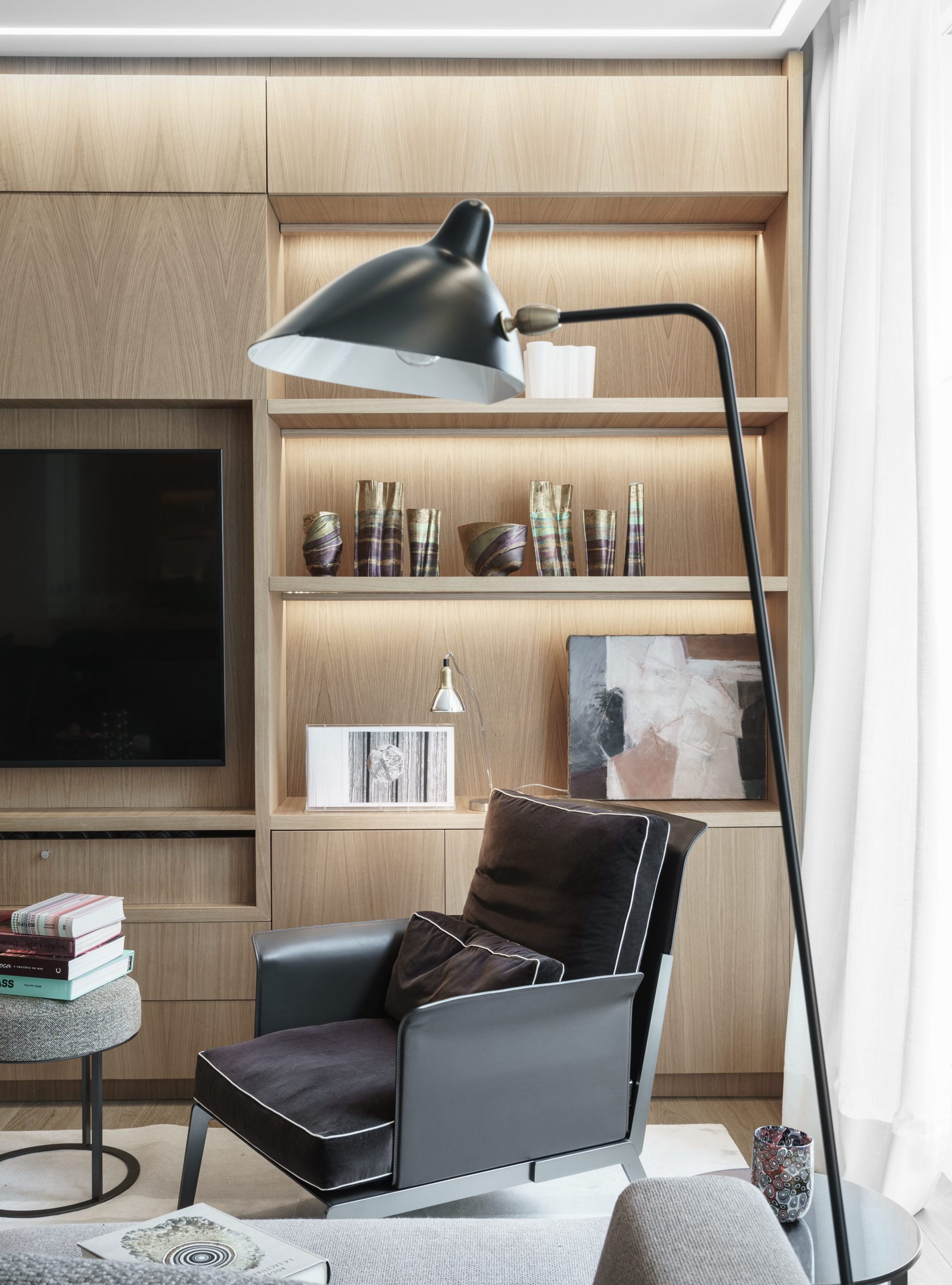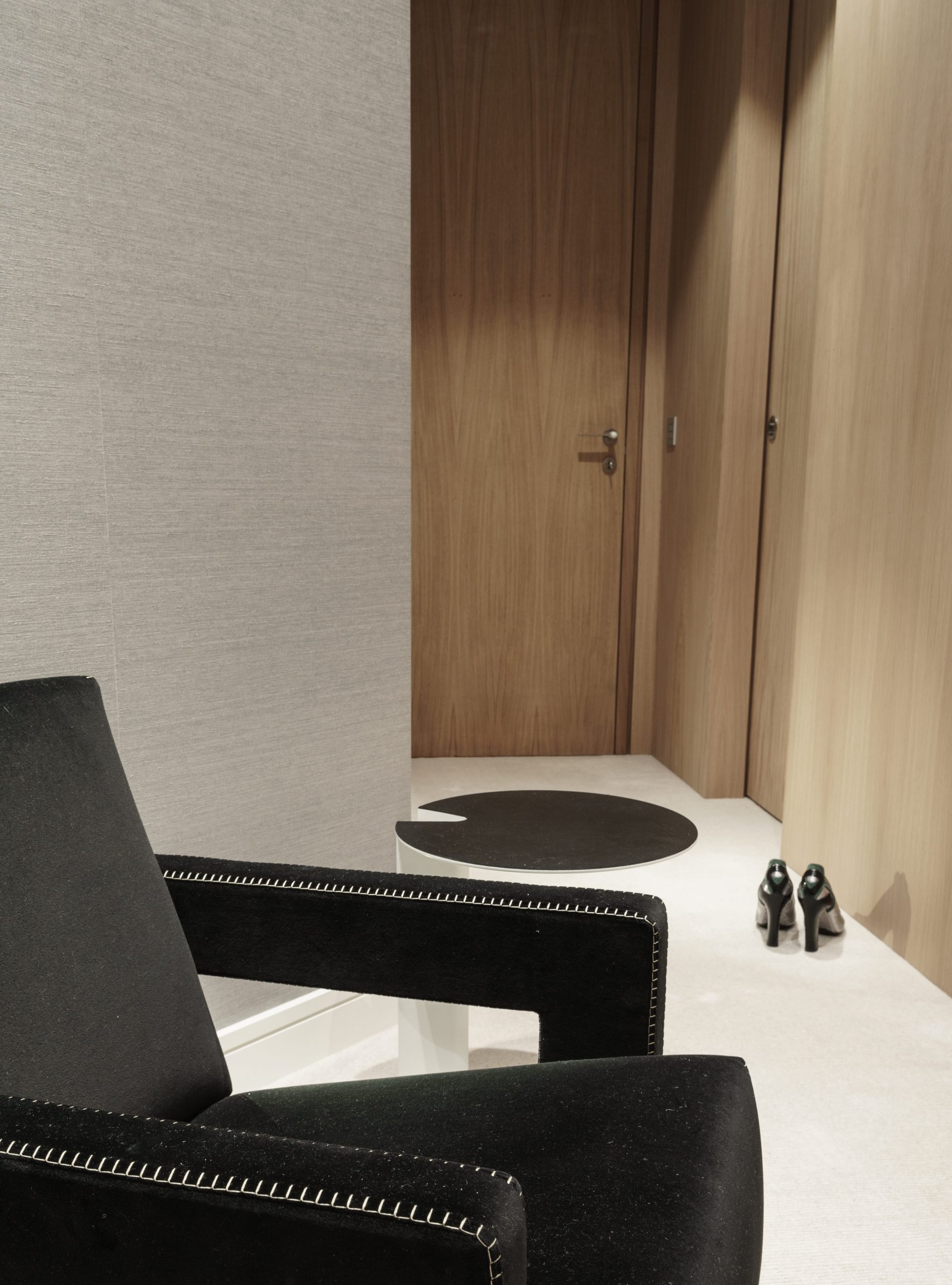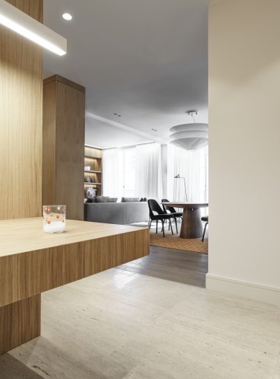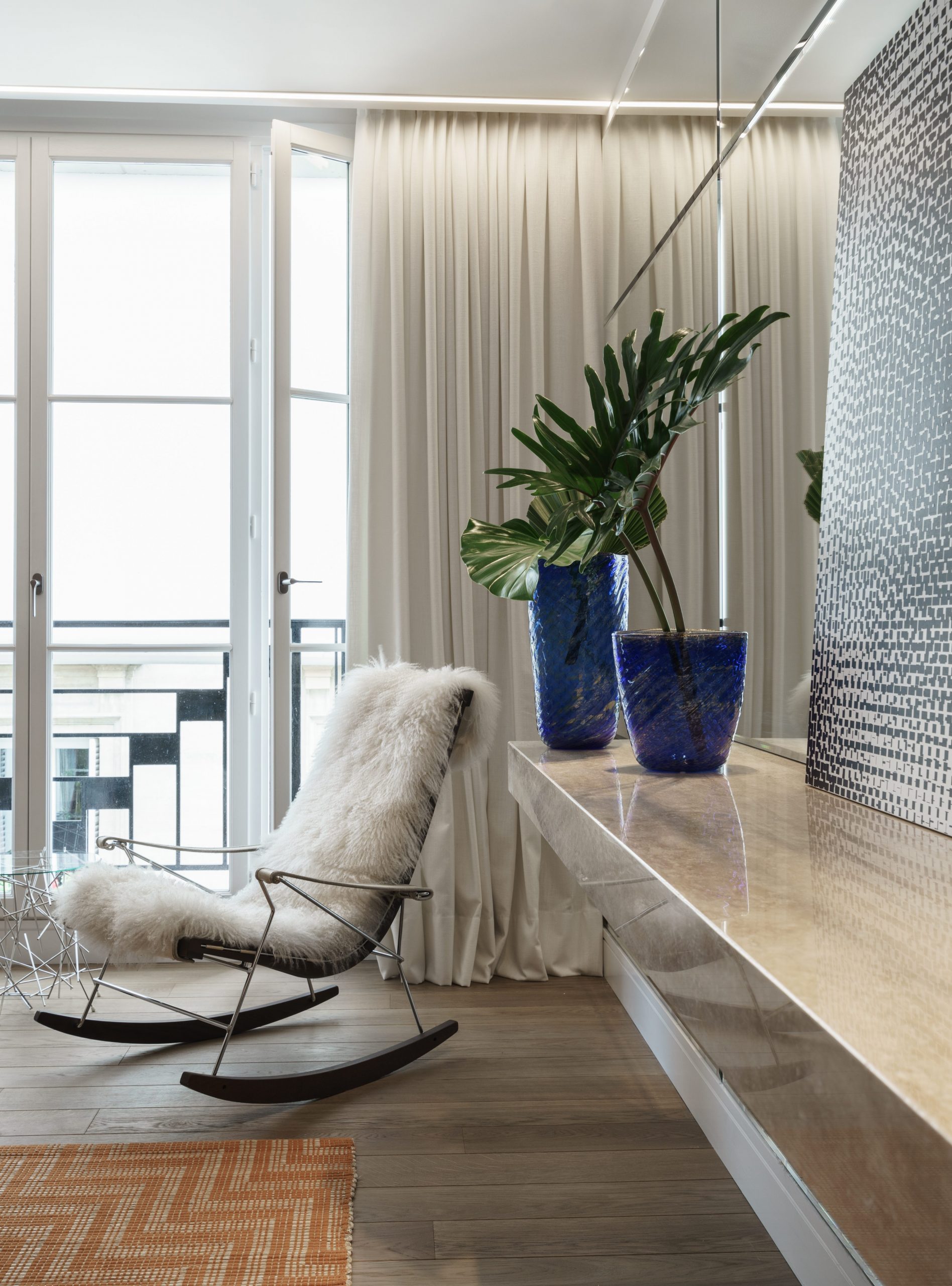 Un appartement entièrement retravaillé pour offrir un pied-à-terre parisien à nos clients. Le bois et la pierre se répondent dans toutes les pièces, les murs sont habillés, les matières nobles dessinent des lignes épurées.