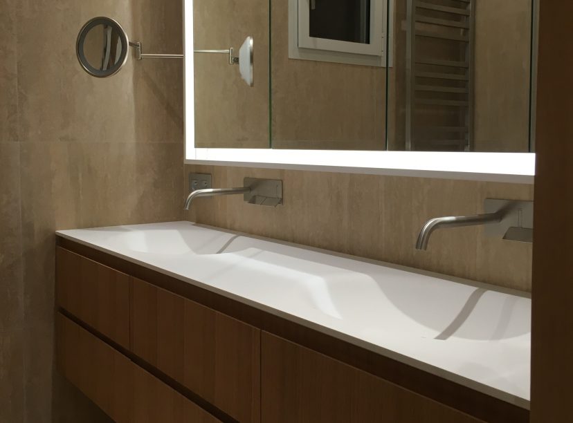 Dans la salle de bain, le meuble vasque sur-mesure en plaquage chêne et corian thermoformées rencontre la minéralité des revêtements en travertin et l'inox brossée de la robinetterie boffi.